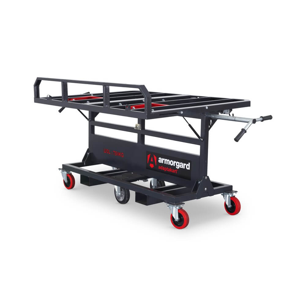 The AdaptaKart AK750 features the SafeStop auto-engaged braking system - brakes are automatically applied when the handles are released, providing instant emergency stopping. All Armorgard products are built in the UK and come with a 12-month manufacturer's warranty covering defects in workmanship.