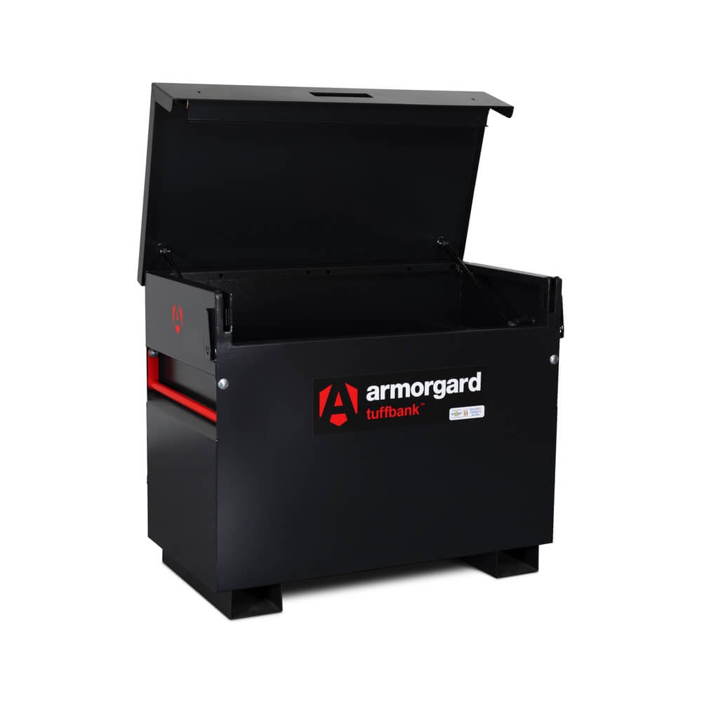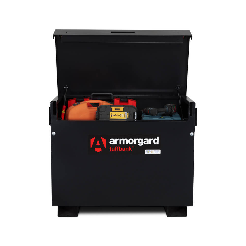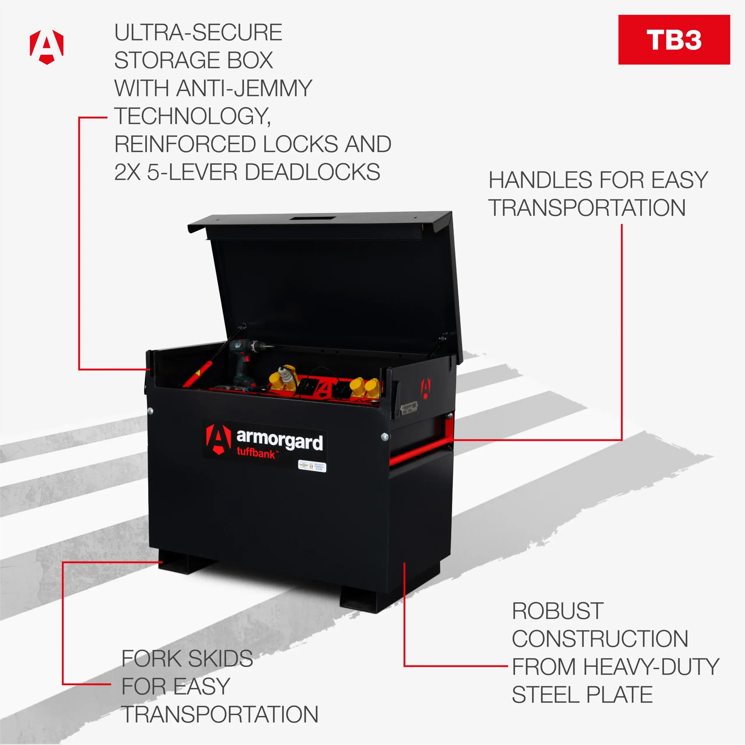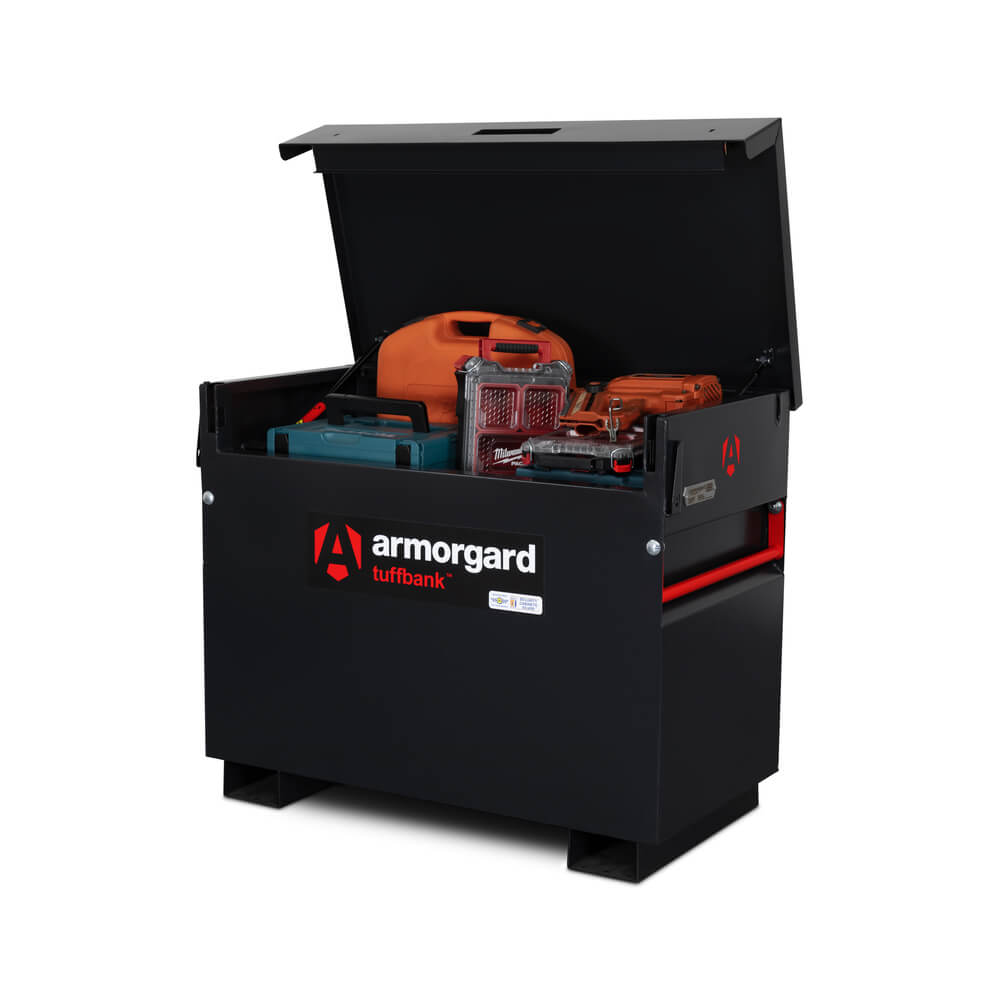 The Armorgard TuffBank TB3 is the tallest single-lid site box in the TuffBank range — offering 840mm of internal height for storing larger power tools, breakers, and bulky equipment. Built from 2mm and 5mm steel with twin keyed-alike IntaLokt 5-lever deadlocks, anti-drill plates, anti-cut deadbolts, and anti-jemmy protection, the TB3 has been independently tested and certified to Sold Secure Bronze, Secured by Design, and Security Cabinets Silver standards. Features forklift pockets for easy repositioning, a cable pass-through point, and compatibility with an optional storage or charging shelf, castors, and crane lifting eyes.