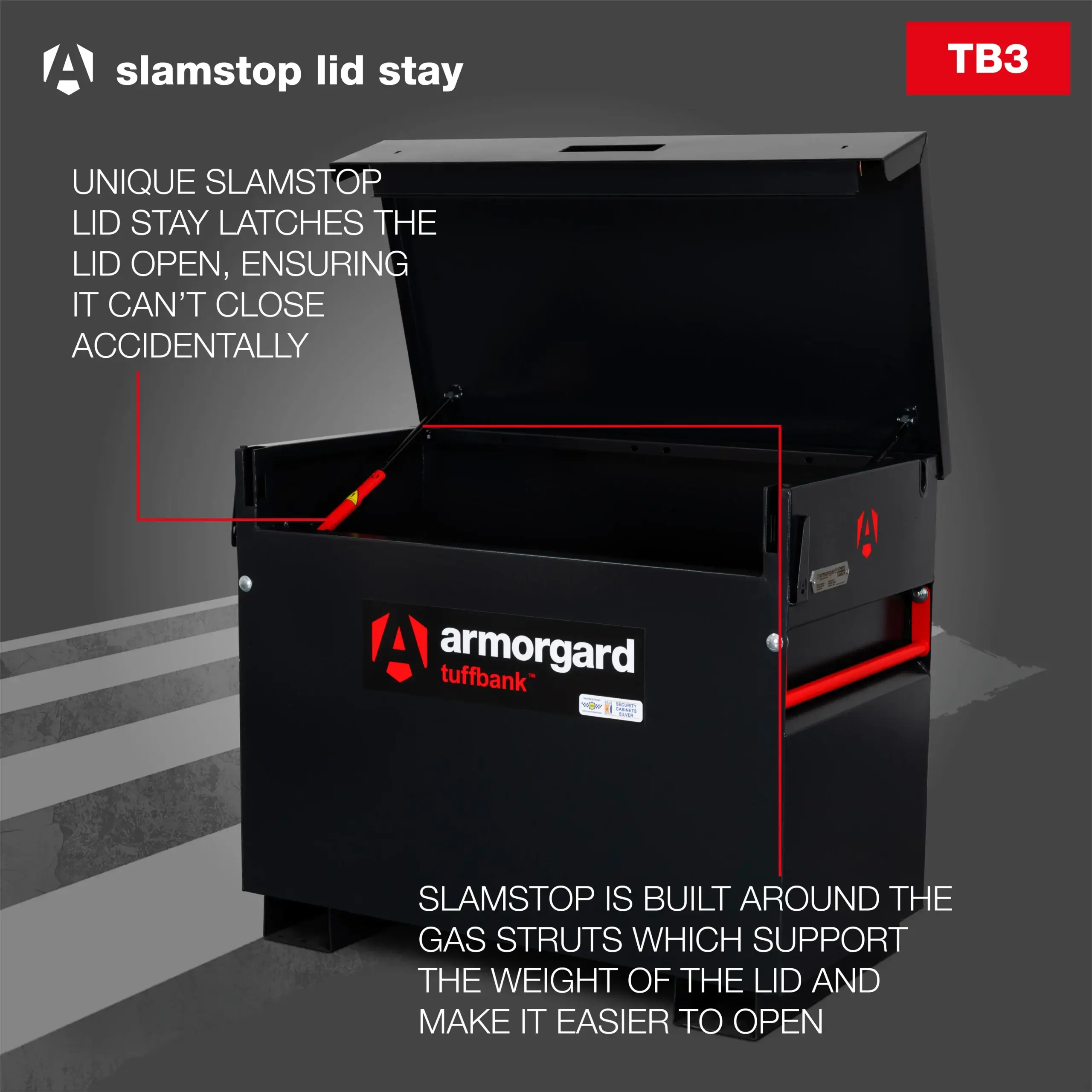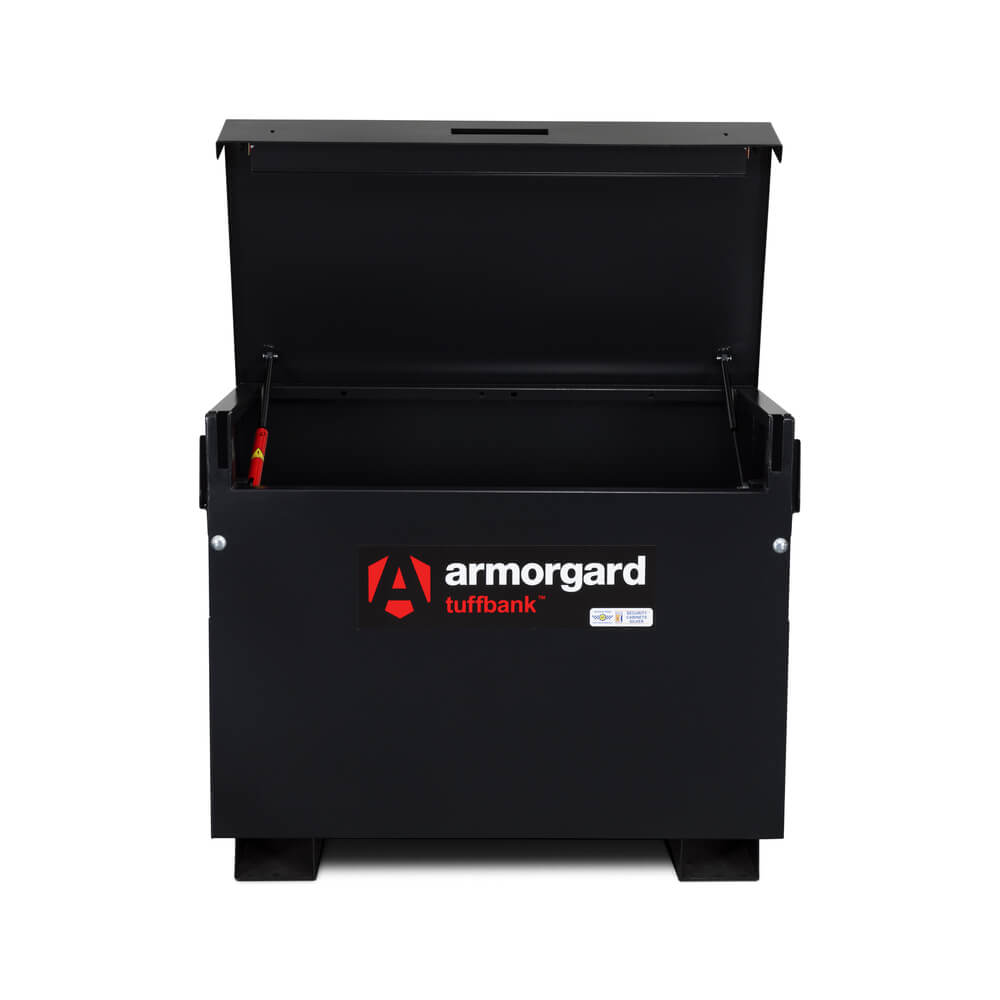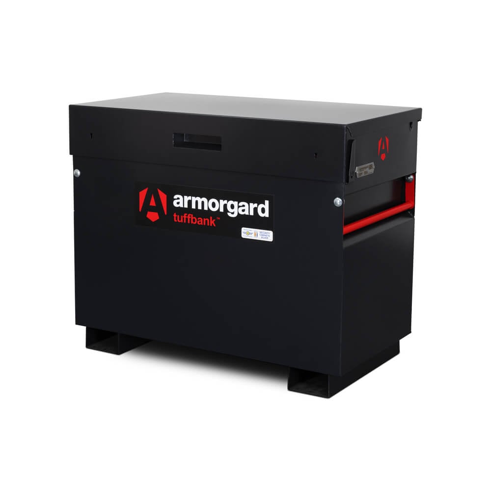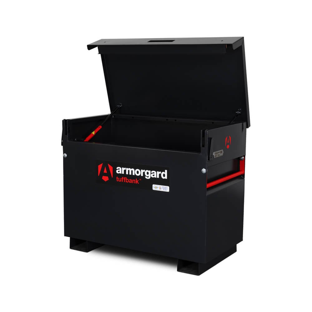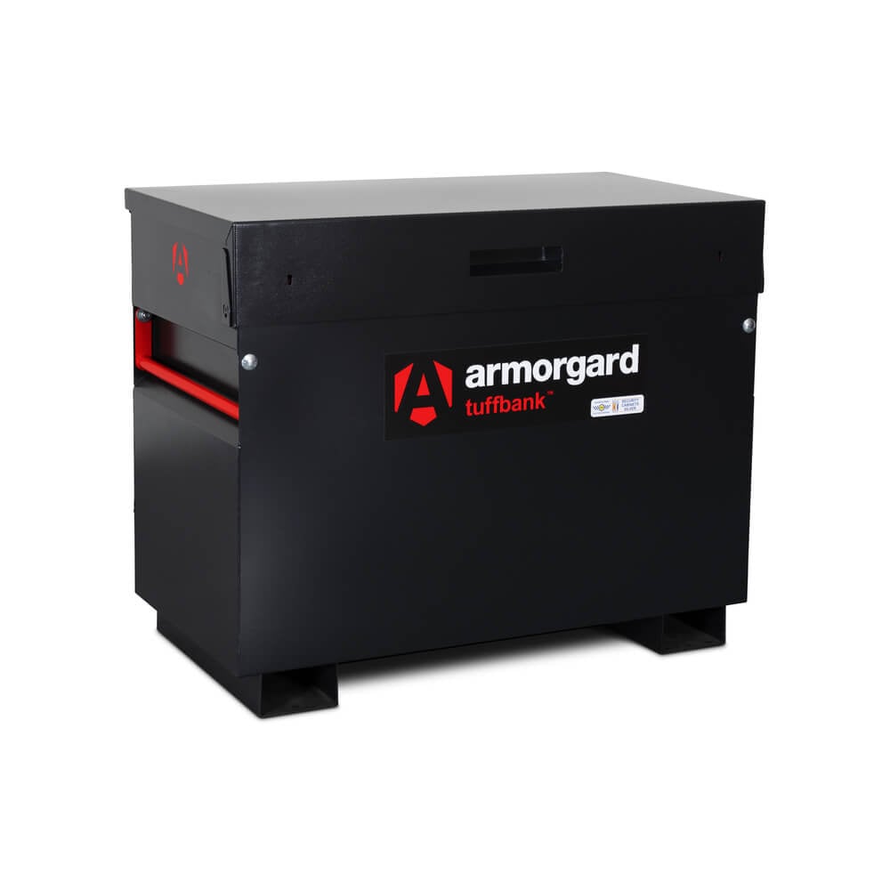 The Armorgard TuffBank TB3 is the tallest single-lid site box in the TuffBank range — offering 840mm of internal height for storing larger power tools, breakers, and bulky equipment. Built from 2mm and 5mm steel with twin keyed-alike IntaLokt 5-lever deadlocks, anti-drill plates, anti-cut deadbolts, and anti-jemmy protection, the TB3 has been independently tested and certified to Sold Secure Bronze, Secured by Design, and Security Cabinets Silver standards. Features forklift pockets for easy repositioning, a cable pass-through point, and compatibility with an optional storage or charging shelf, castors, and crane lifting eyes.