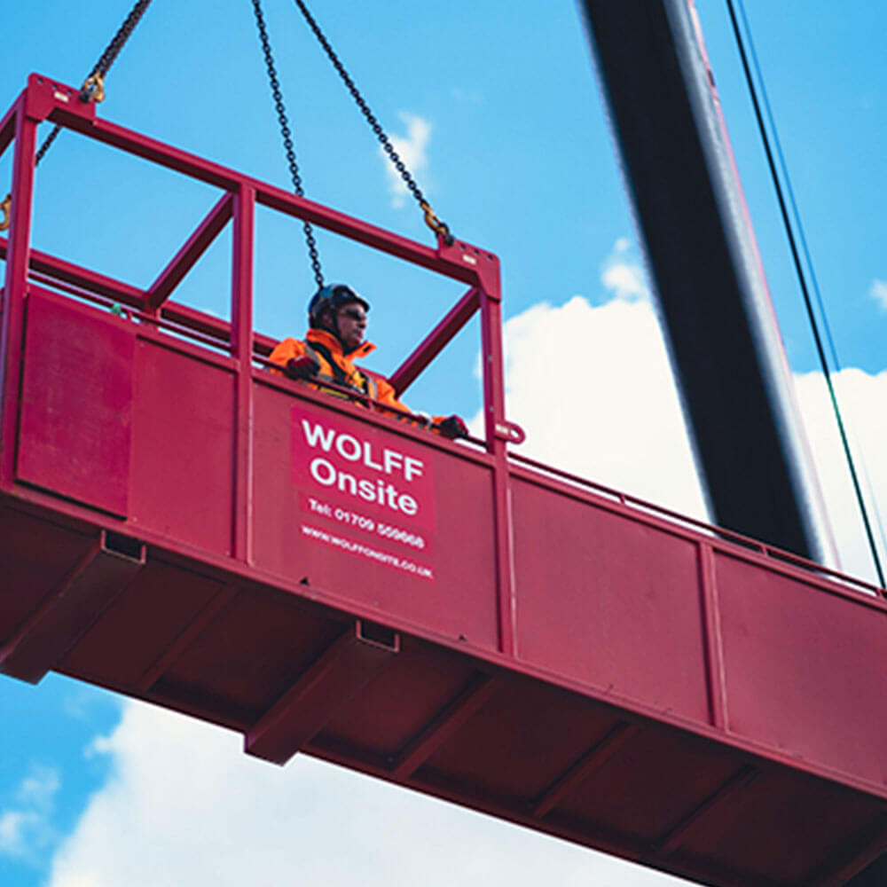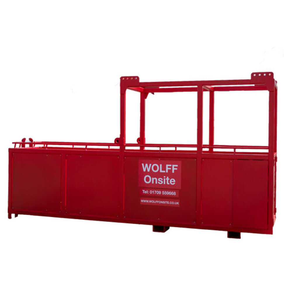 A key requirement for any operational construction site is a facility that ensures the safe and efficient transfer of personnel and materials to and from areas that are otherwise difficult to access. The Offset Access Cage (Big Red) features an extension with sides rising above waist height, complete with a handrail for added safety. Harness points are strategically located between the cage and the extension, ensuring secure and stable transport.